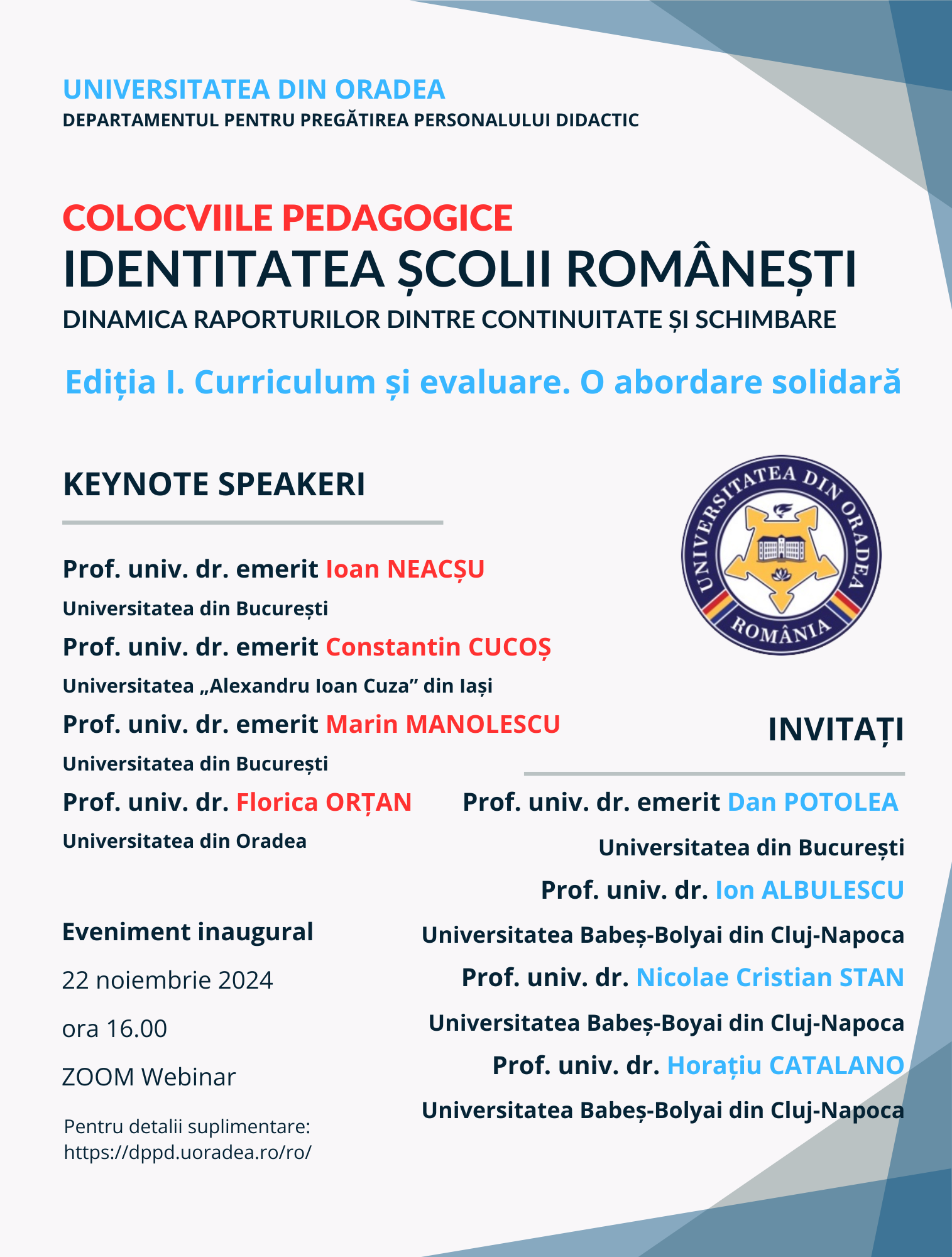 COLOCVIILE PEDAGOGICE - UN EVENIMENT CARE REUNEȘTE SPECIALIȘTII MARCANȚI ÎN DOMENIUL ȘTIINȚELOR EDUCAȚIEI DIN ROMÂNIA (Ediția I - 22.11.2024 ora 16:00 ZOOM WEBINAR) - ÎNSCRIERI