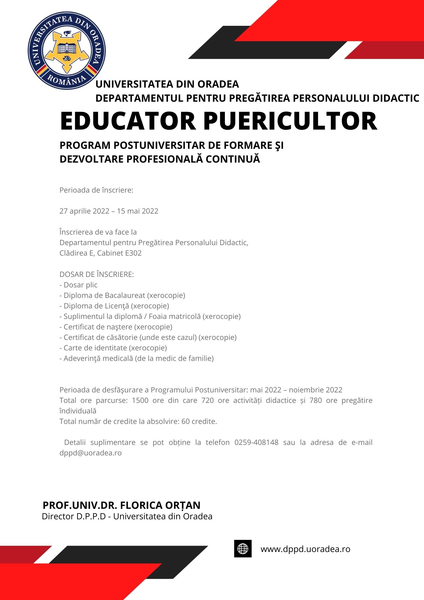 La secțiunile ADMITERE / PROGRAME DE FORMARE găsiți informații privind înscrierea la programele de formare psihopedagogică în cadrul D.P.P.D. - Universitatea din Oradea
