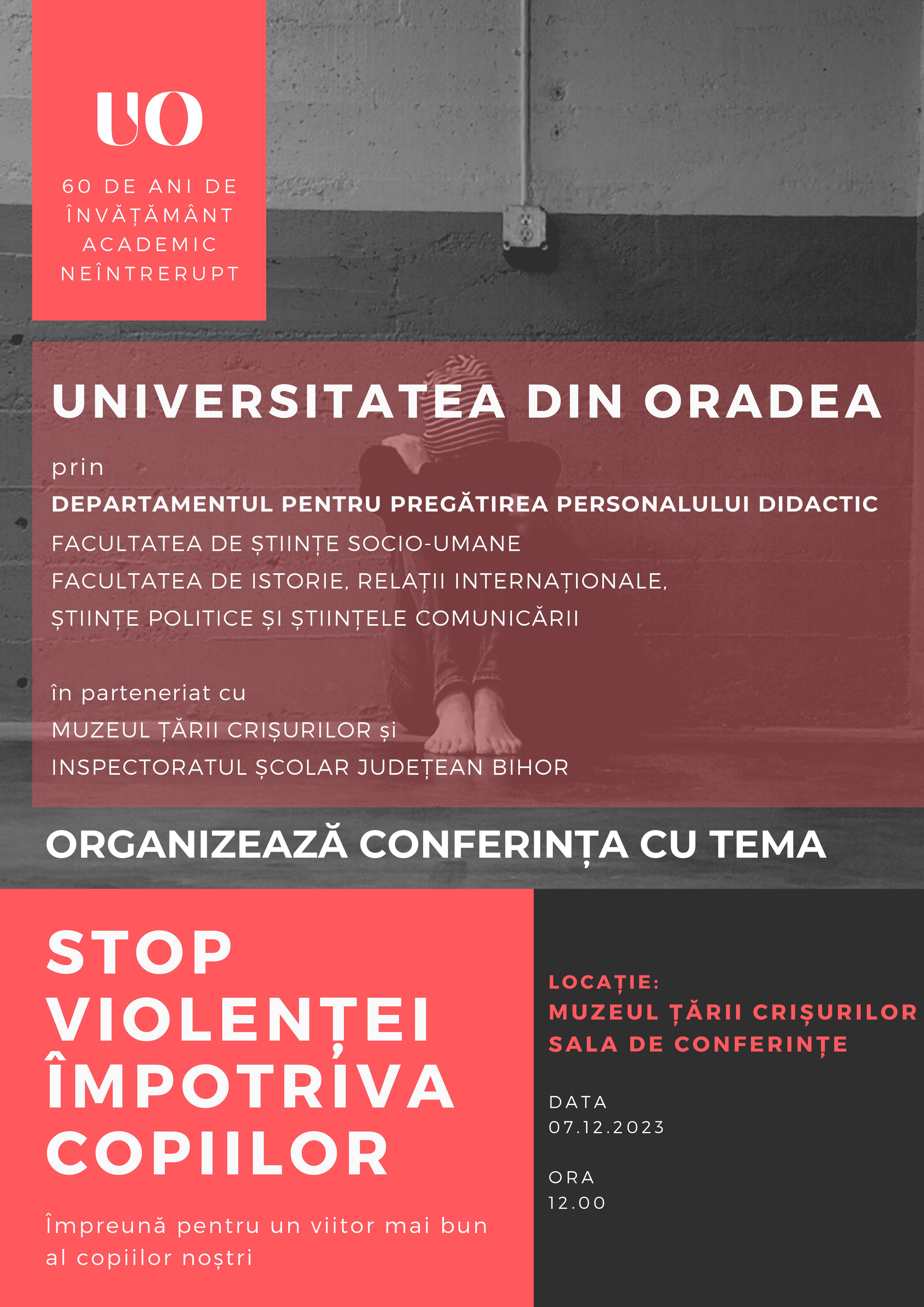 D.P.P.D. VĂ INVITĂ ÎN DATA DE 7.12.2023 LA CONFERINȚA CU TEMA "STOP VIOLENȚEI ÎMPOTRIVA COPIILOR" CARE VA AVEA LOC LA MUZEUL ȚĂRII CRIȘURILOR - SALA DE CONFERINȚE